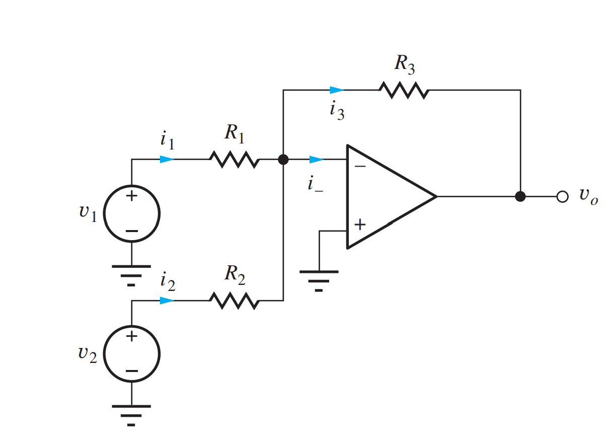 \(i_1 = \frac{v_1}{R_1}\) , \(i_2 = \frac{v_2}{R_2}\) , \(i_3 = -\frac{v_o}{R_3}\)