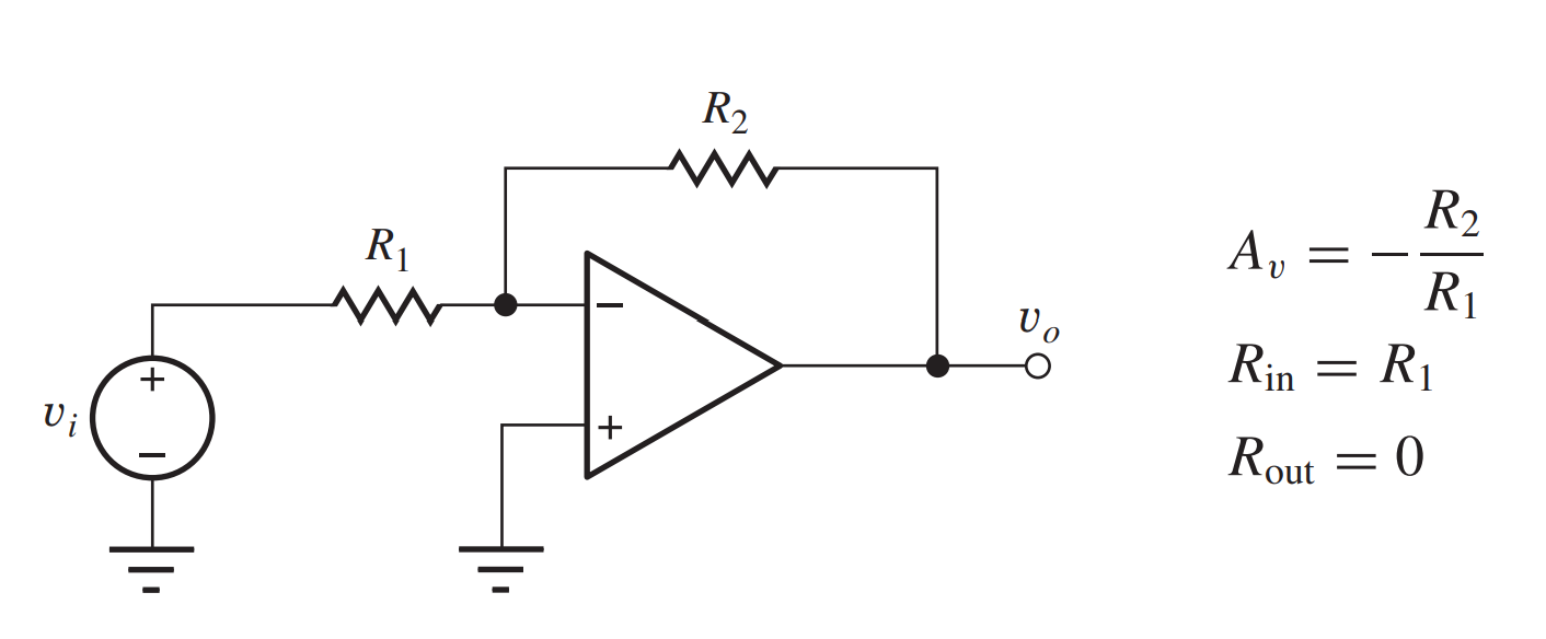 An inverting-amplifier circuit is built by grounding the positive input of the operational amplifier and connecting resistors \(R_1\) and \(R_2\), called the feedback network, between the inverting input and the signal source and amplifier output node, respectively, as in Figure 8.