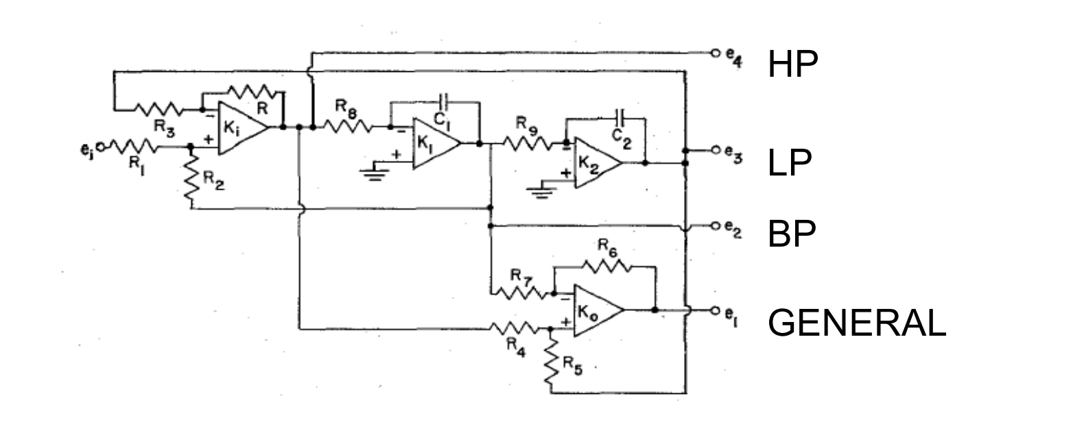 - A Summing Amplifier: This combines the input signal and feedback signals to produce the desired filter outputs.