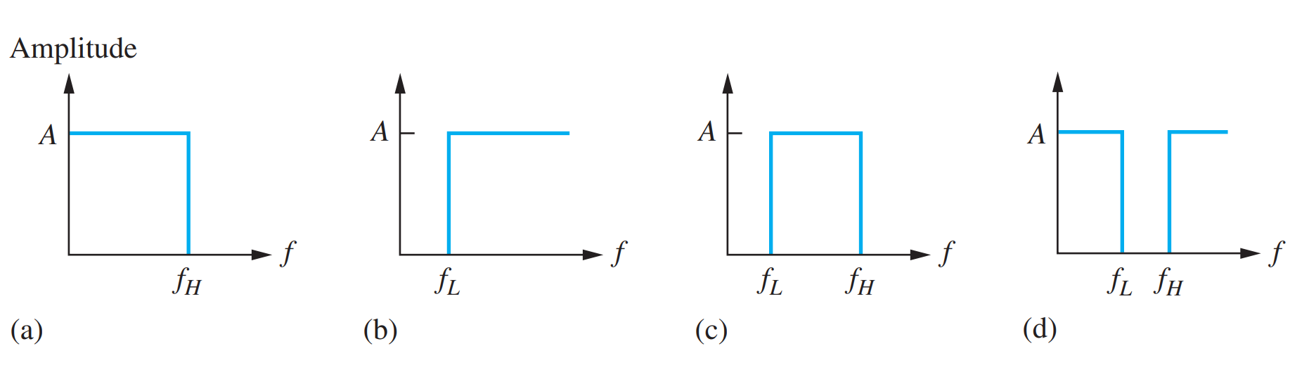 - Band-pass and band-stop filters have both lower and upper cutoff frequencies (\(f_L\) and \(f_H\)) defining their bandwidth.