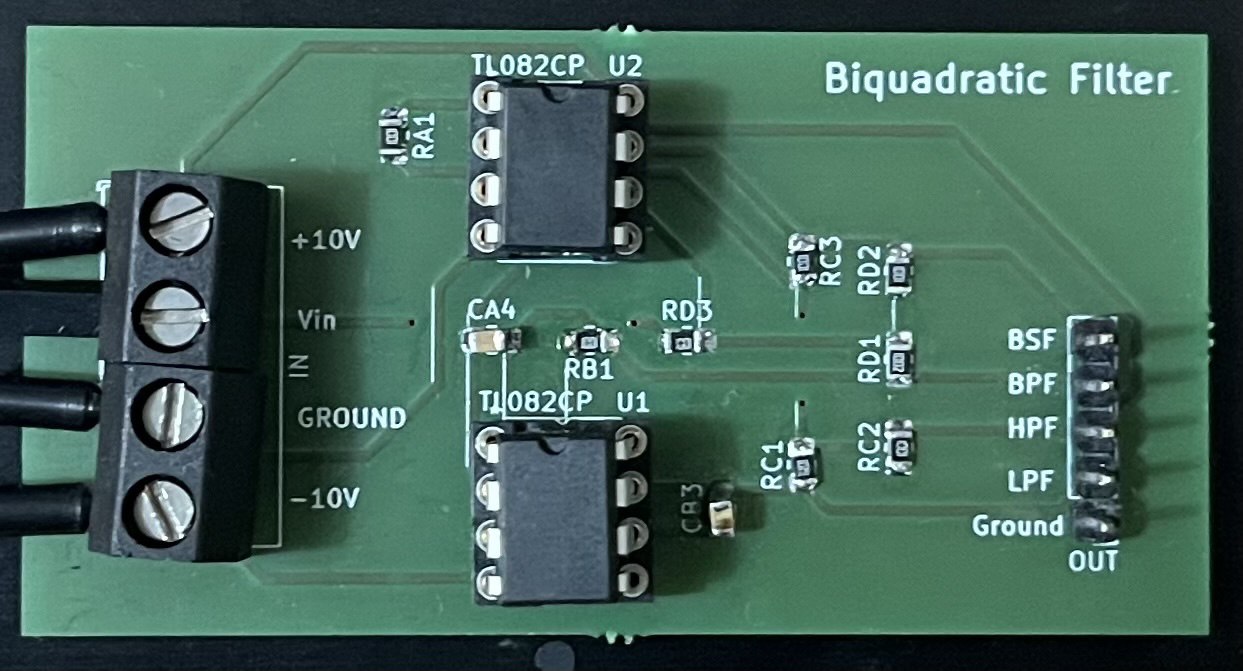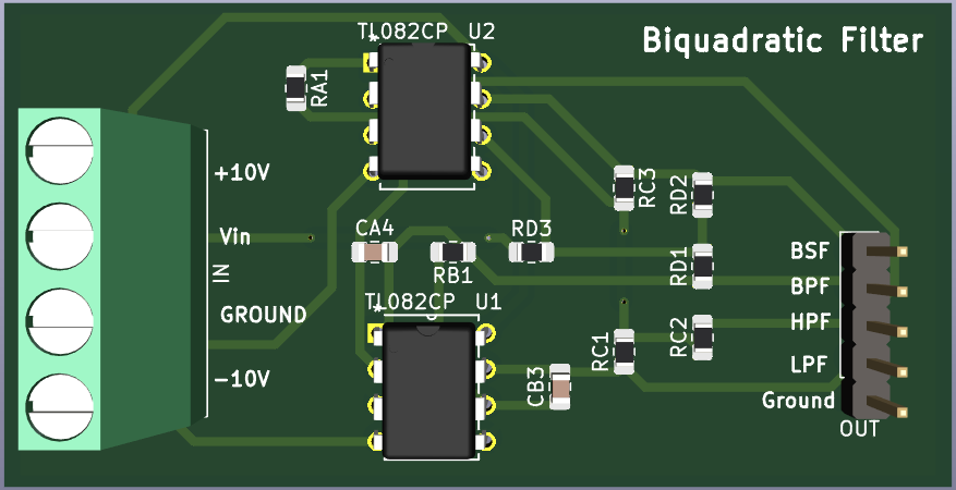 This project centers on the analog circuit design of a universal biquad filter targeting a corner frequency of 1 kHz and a quality factor (Q) of 10. The design process spansthe complete development cycle—from initial specification and simulation to physical layout and hardware realization. Key phases include schematic design, functional modeling, simulation, and full PCB development.