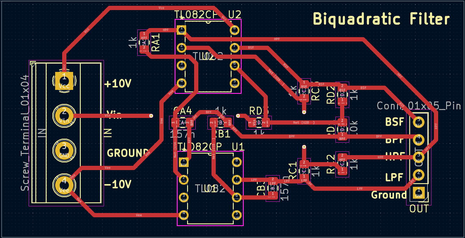 - The outputs are take from the above mentioned op-amps. BPF from U1A, LPF from U1B, HPF from U2A and BSF from U2B respectively.